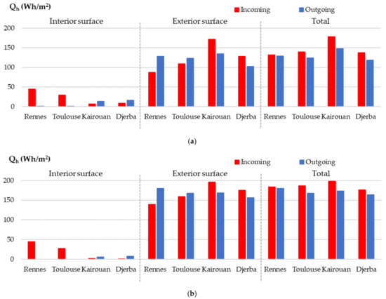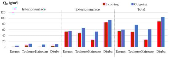 On the exterior surface, the incoming and outgoing moisture are much more important during the last cycle than the ones on the interior surface. Kairouan exhibits the lowest incoming moisture (24 g/m2), Rennes and Toulouse show intermediate values (about 50 g/m2) and Djerba the highest (85 g/m2). The outcoming moisture is similar for Rennes, Toulouse and Kairouan (53 to 65 g/m2) and much higher for Djerba (93 g/m2).