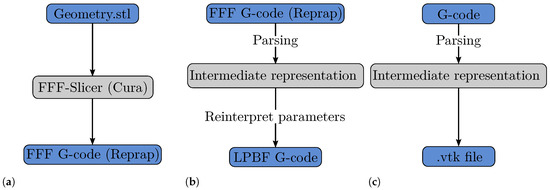 The generation of build jobs is comprised of two steps. First, the .stl file of the desired part is sliced with the open-source FFF slicer Cura 4.7.1. Cura is configured to generate RepRap G-code while retraction and print cooling are disabled, since these parameters are not needed in the LPBF process. The laser power, that is desired for the LPBF process, is set as the numerical value of the nozzle temperature. Similarly, the feed rate is set as equivalent to the scan speed needed. This process is illustrated in Figure 2a.