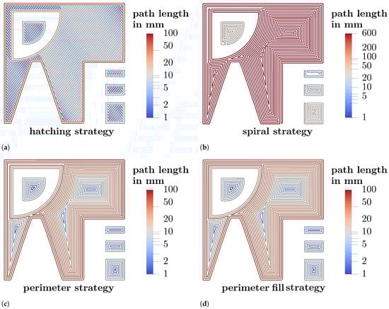 Figure 3 shows a visualisation of the investigated scan strategies. Figure 3a shows the hatching strategy while the same layer sliced with the spiral scan strategy is shown in Figure 3b. It is visible that each connected region is sliced with only one path in the spiral strategy leading to vastly different path lengths. In comparison, the path lengths in the hatching strategy only differ slightly aside from the perimeter paths. It is visible that both the spiral strategy and the perimeter strategy (shown in Figure 3c) cover some areas poorly leading to unintended gaps in certain regions. In this gaps the width is too small for a path to be placed without the line distance falling below the specified value. For example, in the upper left edge of the path of the perimeter strategy (Figure 3c) the geometry has a wall thickness of 1 . The line spacing is set to 150 μm, while the slicer offsets the outer lines a half line spacing each from the border of the .stl. Hence it is possible to place six parallel lines without violating the line spacing criterion, which leaves a 250 μm wide spacing in the centre of the wall. The perimeter fill strategy (Figure 3d) places a line in this regions without considering this limitation. Therefore the line distance in the upper left edge decreases to 125 μm for the added line in the perimeter fill strategy. Moreover, acute angles are generated in inner regions of the paths in all strategies except the hatching strategy. Since a constant path spacing is to be maintained, gaps occur at acute angles for geometric reasons.