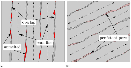 (a): Process sketch showing an arbitrary layer (n). Random fluctuations in the melt pool width result in small unmelted regions (red) between the scan lines. When the scan lines in the next layer (n+1) are rotated about 67° (see (b)), only a small area of the unmelted region of the next layer will coincide with the unmelted regions of the last layer, resulting in persistent pores. If the scan lines are not varied in position, the unmelted regions will coincide more frequently.