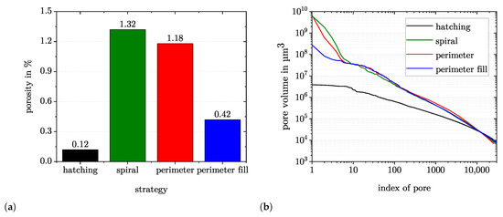 In order to assess the pores constituting the porosity values, all pores of the four samples were sorted in descending order according to their volume and then plotted in the double logarithmic diagram in Figure 7b. The samples each contained around 30,000 ± 4000 pores. It is visible that the spiral and the perimeter strategies lead to similar size distributions. Only about ten pores are large compared to the rest of the pores. These pores correspond to the pores resulting from the gaps in the path placement, for example, the corner shaped pore in the upper right edge (cf. Section 3.1 and the µCT images in Figure 4). The perimeter fill strategy thus shows a similar distribution with the exception of the ten largest pores, which are reduced in size over an order of magnitude compared to the perimeter strategy. In contrast, the hatching strategy results in a pore size distribution with overall smaller pores than the other three strategies. Here, the largest pore is over three magnitudes smaller than in the spiral or perimeter strategy. This is due to the change in pore formation mechanisms. The keyhole porosity contributes a large portion of the porosity in the hatching strategy. Although the contribution of keyhole porosity to overall porosity is reduced in the alternative strategies, the formation of lack of fusion porosity in these strategies leads to higher porosity values overall.