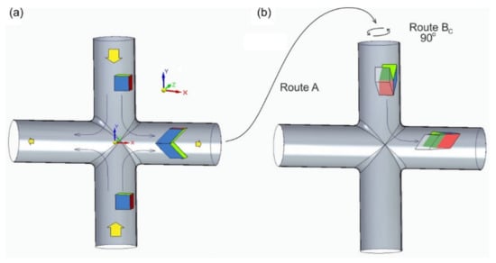 In the scheme according to route A, the sample is processed without rotation between successive passes, and the shearing plane and direction are the same in both even and odd-numbered passes. Route B consists of rotating the sample by an angle of 90° around the extrusion axis, wherein in the BA variant, the specimen is rotated in an alternating clockwise direction and the BC variant, only unidirectionally. For both variants, shearing occurs at different shearing planes for each pass, repeated after two successive passes without any inversion in the shearing direction for the BA route and after four passes with inversion of the shearing direction for BC. In route C, the specimen is rotated by 180° between subsequent passes, and the shearing plane is always the same in successive passes, but the shearing direction is inverted after each pass [11].