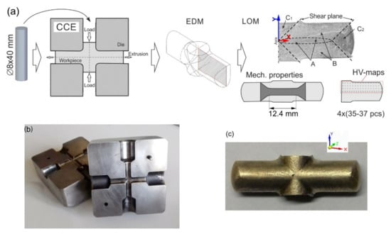 Illustration of CCE process: scheme (a), die (b), and specimen after processing (c).