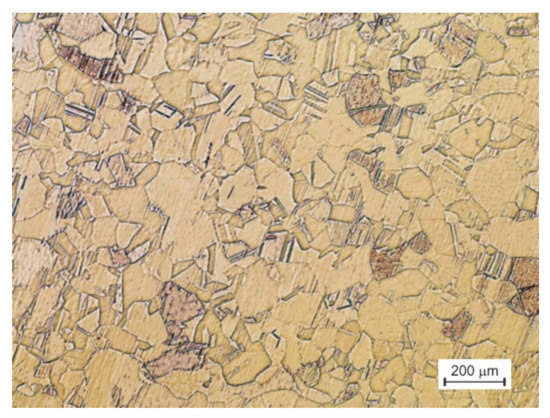 The material structure in its initial state, i.e., after recrystallization annealing, is shown in Figure 3. It is characterized by an equiaxed grain with an average size of 64 µm.