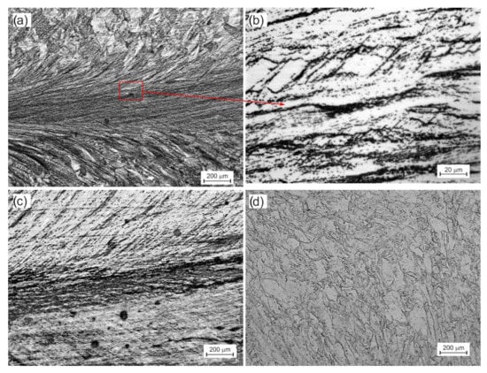 A second large B zone associated with shear stresses was created on both sides of the band A zone. The structure of the material was deformed with many slip bands. The grains (60 µm) were slightly distorted toward the outer surfaces, related to passage through the shear plane. As the number of passes increases, the deformation of the material increases. As shown in Figure 5c, this results in a homogeneous structure in each of the zones but also leads to blurring of the grain boundaries. For this reason, determining their size using stereological methods has become unreliable. The strand structure (A) was limited, and the thickness of the individual strands decreased. However, zone B is enlarging and homogenizing at the same time. The third tapered C-zone (Figure 5d) associated with blocked stresses was observed directly under the die piston (C1) or on the newly formed foreheads of the sample (C2). Their grains underwent much less deformation because they were not subject to the two previously mentioned deformation mechanisms.