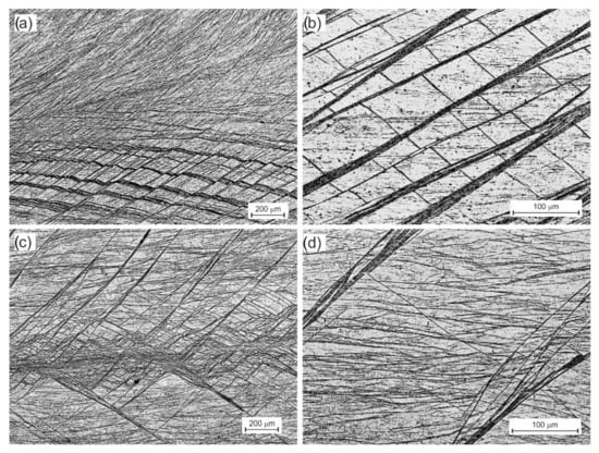 This process was slightly different in BC route. As a result of the rotation of the sample by an angle of 90°, the shear bands formed in the first pass intersected with new second pass bands (Figure 6a). While in zone An, it has not caused any discernible differences, in zone B, it has. The intersecting strands form equilateral cells, 20 × 30 µm (Figure 6b) and larger. As they move away from the X-axis and zone A toward the outer surface, their size increases rapidly, and they begin to resemble those 2× in A-CCE. The subsequent two passes deepen this process (Figure 6c). A further division of the structure with the formation of orthorhombic cells with a side even slightly above 1 µm was observed, or the initiation of the process of dynamic reconstruction structure in the areas defined by shear bands (Figure 6d).