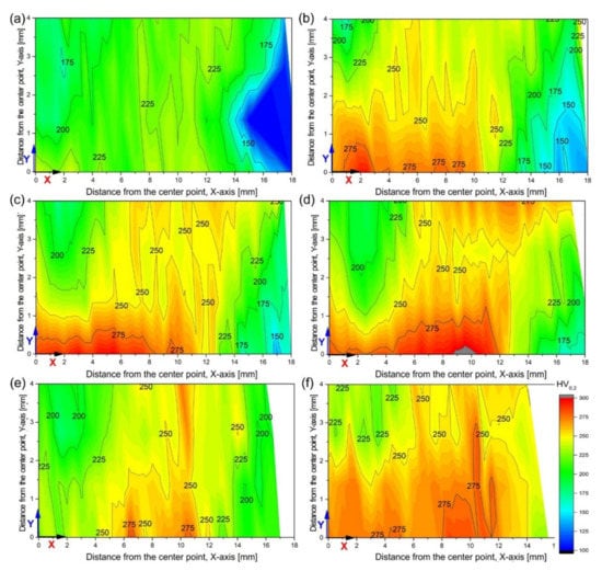 Evolution of microhardness in CCE process: 2× (a), 4× (b), 8× (c), 12× (d) in A route and 2× (e), 4× (f) in BC route. The maps concern one-fourth of the sample area delimited by the X and Y axes, according to scheme in Figure 2a.