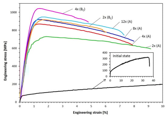The yield point and tensile strength showed a substantial increase from 76 and 307 MPa to 650 and 730 MPa, respectively, after two passes in A-CCE. These results, combined with a drastic decrease in elongation to ~9.8%, indicated a strong deformation strengthening of the material. The increase in deformation leads to a further increase in these parameters, even up to 920 and 948 MPa. This is equivalent to an almost threefold increase from the initial state. However, in the BC-CCE variant, the material shows an even faster and greater increase in strength at the expense of its elongation. 2× in BC-CCE is higher than 8× in A-CCE and is close to 12× in A-CCE.