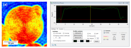 In this technique, recorded profiles along the green lines visible on the phase images represent the one-dimensional distribution of optical way changes (Figure 8, Figure 9 and Figure 10). Optical way is the product of both refractive index and geometrical way. Refractive index depends on the density of the sample. Therefore, the observed phase change also gives information about the density distribution in the sample. Recorded profiles enabled us to measure differences in the phase change Δφ (in deg) when the laser beam passes through the crystallites, as compared to the phase when the beam is passing through the amorphous area. The scale marked on the x-axis is in µm.