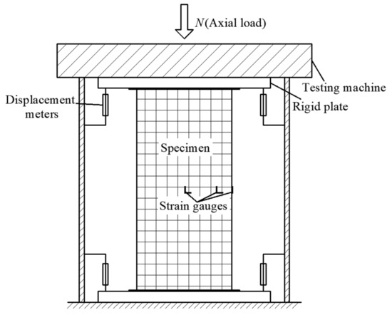 The compressive test setup is presented in Figure 3. The deflection of column was measured by four displacement meters at the supports. The local buckling was observed and the corresponding load was recorded. The axial and lateral strains of steel tubes were measured by strain gauges, as shown in Figure 1. The 15% of the estimated ultimate load was exerted 2–3 times as a preload. Then, the loading regime was controlled under deflection with 0.02 mm/s at initial stage, and the loading rate was reduced to 0.01 mm/s when the force was near the peak load until failure. The testing program was stopped when the three following phenomena occurred: (1) residual bearing capacity is less than 50% of peak load; (2) seam welds were cracked; (3) axial deflection reached 4% height of columns.