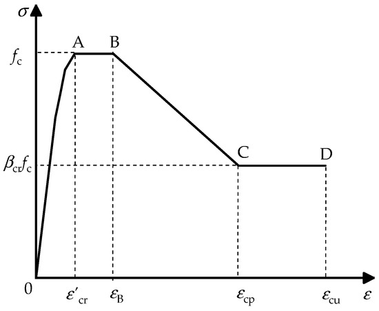 where, εB and εcp are strains corresponding to point B and C in Figure 4, and equal 0.005 and 0.015, respectively; βcr is the parameter for σ–ε curve of concrete at the declined stage. According to reference [27], βcr is determined by the following equations: