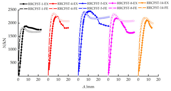 The calculated ultimate strengths for RRCFST columns with and without tie bars through Equation (10) are compared with the experimental results, as shown in Table 4. The average ratio of Nc/Nu is 1.104, with a variation coefficient of 0.079. A good agreement is presented between calculated and experimental results of bearing capacity.
