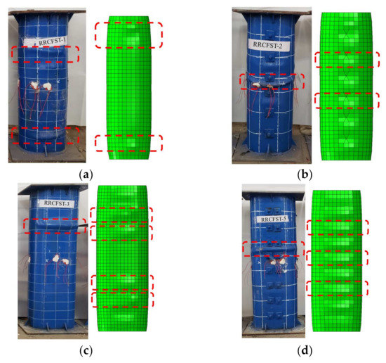 Figure 8 shows the failure modes of part of RRCFST specimens in the experiments and FEM. The columns with a designed aspect ratio of 1.5 (Figure 8a,b) are close to circle CFST with better confinement effect; the local buckling occurs after the ultimate load with a lower buckling amplitude compared to other columns.