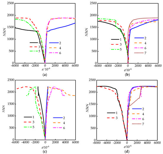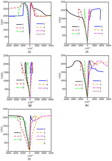 Figure 9 shows load–strain curves of partial specimens; the strain measuring points can be seen in Figure 1. The negative and positive values represent longitudinal and lateral strains of the steel tube, respectively. For RRCFST columns with low designed aspect ratio (e.g., 1.5), the tie bars have no obvious effect on the strain of the steel tube, probably because of the already existing good confinement from the steel tubes. While, for the RRCFST columns with a larger aspect ratio, as shown in Figure 9c,f, the development of longitudinal strains far exceeds the lateral strains. The longitudinal strain reaches the yield strain of the steel tube, while the transverse strain is still at a lower value, and the restraint effect of the steel tube was not fully exerted. As shown in Figure 9d–e,g–i, the development of longitudinal and transverse strains is relatively consistent. The axial strain of tie bars is close to the transverse strain of steel tubes, indicating that the restraining effect of steel tubes on inner concrete is obviously improved by tie bars.