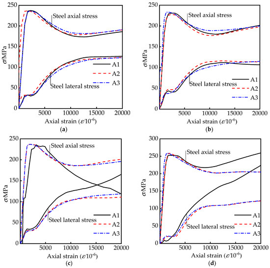 To give further insight on the influences of geometrical sizes of column and tie bars on the restraint effect of steel tubes, some stress–strain curves from FEM analysis at each measuring point are demonstrated in Figure 10. Depending on the research in reference [13], the efficient confinement effect is reflected by the separates between the lateral and longitudinal stress–strain curves. Figure 10a,b shows that the separates between the curves of two directions are raised with the increasing aspect ratios, and lead to a reduced confinement effect. The confined effect of the steel tube in the rectangular area is obviously increased after adding the tie bars, even two curves are crossed in Figure 10c.