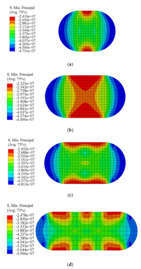 Since the concrete with no obvious yield point, the third principal stress, i.e., maximum compressive stress is adopted in this study to analyze the stress condition of the concrete. Some finite element results of concrete stress diagrams in the middle section are presented in Figure 11. The stress distribution of concrete is changed by tie bars; the low-stress areas with red color in the rectangular area are redistributed and reduced. It indicates that the confinement of steel tube on concrete is improved and the stress of the concrete is increased by adding tie bars.
