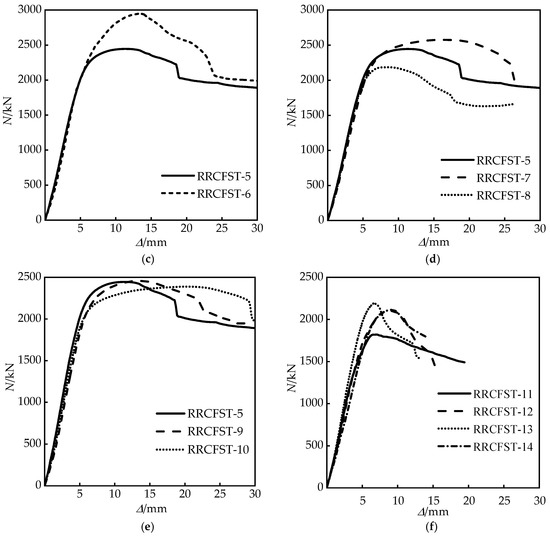 Figure 12 presents load–displacement curves of each specimen. As can be seen in Figure 12a, for the columns with a designed aspect ratio of 1.5, the ultimate bearing capacity and the descent curve are slightly improved by the tie bars due to the limited confinement increasement, which is illustrated in Section 3.2. Figure 12b–e indicate that the tie bar has a large influence on the descent curve trend of the specimen with the designed aspect ratio of 2. The curves drop smoothly after the ultimate load, and the ductility can be improved when the number of tie bar limbs increases (Figure 12b), and a similar tendency is observed for the specimen with the designed aspect ratio of 3 (Figure 12f). According to the analysis in Section 3.2, the confined effect of steel tube (Figure 10b,c) and the section stress distribution (Figure 11b,c) of concrete are improved by tie bars. The stiffness of the specimen is promoted, which leads to the improvement of the development trend of the above curves. The descending stage of the curve (Figure 12d) is greatly affected by the longitudinal distance of tie bars (bs), the enveloping area under the curve is enlarged with an increased bs, which reflects that the longitudinal distance of tie bars has a great improvement on the ductility of RRCFST column. However, Figure 12e shows that the shape of the curve has a tiny relationship with the diameter of tie bars. By increasing the thickness of the steel tube (Figure 12c), the ultimate bearing capacity, ductility and energy absorption capacity of the test piece are significantly improved. In Figure 12f, curves of RRCFST-12 and RRCFST-14 share a similar trend. For RRCFST-14 with 3 limbs of tie bars, the middle tie bar has a more efficient contribution to bearing capacity than the two side tie bars due to the adequate utilization of tie bar deformation and strength, and curves 7, 8 in Figure 9i also illustrate this phenomenon.
