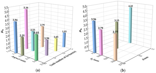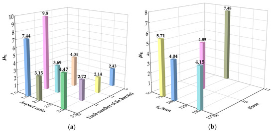 Figure 13 presents the displacement ductility of the specimen under different parameters. As shown in Figure 13a, the inelastic deformation capacity of the columns with small aspect ratios increases greatly with an increase in the number of tie bar limbs. While for columns with high aspect ratios, the addition of tie bars has a negative impact on its ductility due to the larger loss of lateral stiffness, and the inelastic deformation capacity is weakened after the tie bars fail. Figure 13b shows the influence of different tie bar parameters on the ductility of the specimen. The longitudinal spacing and diameter of tie bars have a great promotion on their ductility. In particular, the diameter of tie bars changing from 8 mm to 12 mm greatly enhances displacement ductility by 58.4%. The deformation ability of the specimen is effectively improved with the reduced longitudinal spacing and increased diameter of the tie bars.