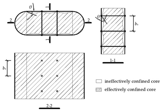According to the stress diagram from finite element analysis in Section 3.2, the idealized partitions of effectively and ineffectively confined areas for the cross-section of RRCFST column with tie bars are presented in Figure 17, where θ is the initial tangent angle of the ineffectively confined area and given by Formula (16) [18].