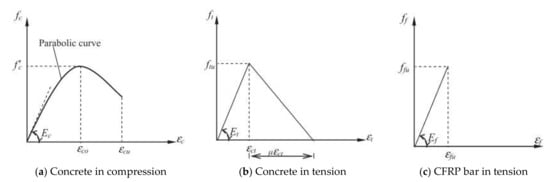 where and are the CFRP bar tensile stress (MPa) and strain, respectively; is the CFRP bar tensile modulus of elasticity (MPa); and, is the CFRP bar ultimate strain.