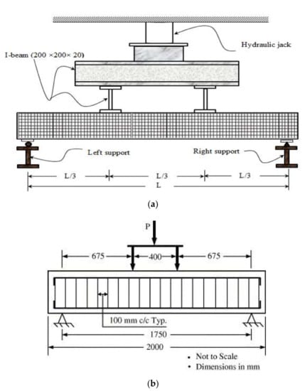Typical rectangular CFRP RC beam specimens were commonly tested under a flexural test. The beam specimens were frequently subjected either to a single or pair of point load, as shown in Figure 2. The beam specimens were simply supported with hinge support at one end and roller support at the other end. The test parameters were varied, including the concrete compressive strength and the material characteristics of CFRP bar, particularly on different types of surface treatment and reinforcement ratios [,,,,,,,,,,,]. Strain gauges were internally installed on the CFRP bars’ reinforcement to record its tensile strains throughout the test period. They were bonded using adhesive and were fully waterproofed before pouring the concrete into the formwork. Prior to conducting the flexural test with a minimum concrete age of 28 days, strain gauges were also installed on the surface at the top of the beam specimen to measure concrete compressive strains, whilst, beam deflections were measured using a linear variable differential transformer (LVDT) located at the mid-span beam. In addition, horizontal LVDTs may be placed at both sides of the beam specimen in order to measure the slip between CFRP bars and concrete during the flexural test []. A data-acquisition module was monitored by a computer to record the readings of the strain gauges, LVDTs and load cells.