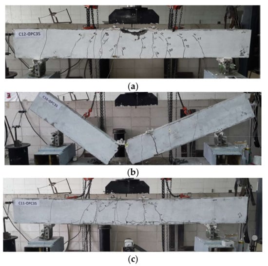 On the other hand, splitting cracks along the reinforcement could appear on the concrete beam prior to flexural cracks. This type of crack was induced due to bond and anchorage failure between the reinforcement and concrete [,]. Hence, it should be avoided anyway in order for CFRP RC beams to achieve their ultimate flexural strength capacity.