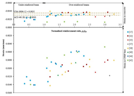 Further comparative studies with over-reinforced beams have found that the compressive strains in concrete were between 0.0026 and 0.0040. It can be observed that only 24.2% of beams had recorded concrete compressive strain over 0.0035, whilst, 63.6% were over 0.0030. Therefore, the assumption of a maximum concrete compressive strain of 0.0030 is more reliable in computing the nominal flexural strength. Tensile strains in CFRP bars for over-reinforced beams, however, were recorded in the range of 28.4% to 84.2% of their ultimate capacity. The beams had failed by concrete crushing without CFRP bar ruptures. The over-reinforced beam (i.e., ρf/ρfb ≥ 1.4) is so-called compression-controlled failure [].