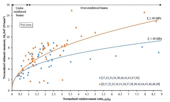 Figure 7 is plotted for two different concrete compressive strengths, categorized as lower than 40 N/mm2 and greater than 40 N/mm2. The strength limit state for the under-reinforced and over-reinforced beams is identified and marked on the graph. This comparative study has found that the concrete compressive strength has a less significant impact on the normalized ultimate flexural moment capacity for under-reinforced beams. However, it has a remarkable impact on over-reinforced beams. This characteristic is attributed to the compression-controlled behavior where the beam failure is more reliant on the concrete rectangular stress block in compression. For the under-reinforced beam, the material properties of the CFRP bar bond strength between CFRP bars to concrete govern the ultimate moment capacity of the beam itself. The concrete tensile strength in the tensile zone area is ignored [,,].