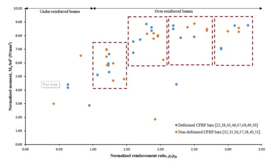 Figure 8 presents scattered data on the normalized ultimate flexural moment capacity against normalized reinforcement ratio with respect to deformed and non-deformed CFRP bars. The data pattern was grouped in the red rectangle. It can be observed that non-deformed bars require a higher reinforcement ratio to achieve about the same values of ultimate flexural strength for deformed CFRP bars. This behavior can be attributed to the variation of bond stress transferring mechanisms between CFRP bars and concrete.