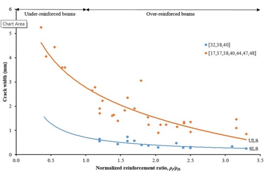 Relationships between crack width and normalized reinforcement ratio at SLS and ULS [,,,,,,,].