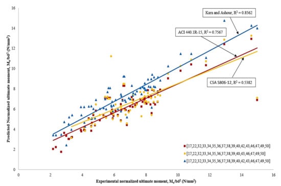 Comparison on the predictions for ultimate normalized moment capacities against experimental moment capacities [,,,,,,,,,,,,,,,,,,].