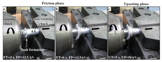 The friction welding process was divided into the friction phase (Figure 2a,b) and the upsetting phase (Figure 2c). TC samples were placed in the spindle, while the samples from the aluminum alloy were supported by the welding machine. The friction process took place after the axial pressure on the samples. The friction time lasted from 0.5 to 9.5 s. During this phase, the AA sample was shortened, and the flash formed slowly. The second phase of the friction welding process was the upsetting phase, which lasted for five seconds. During this phase, the spindle stopped abruptly. Then the axial pressure was exerted on the samples [25]. The result of this process was the formation of a flash on the AA part, as shown in Figure 2c.