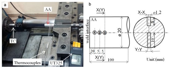 Friction welding can be divided into rapid heating and continuous cooling processes. A rapid temperature rise occurs during the heating process due to the intense friction between the samples [26,27].