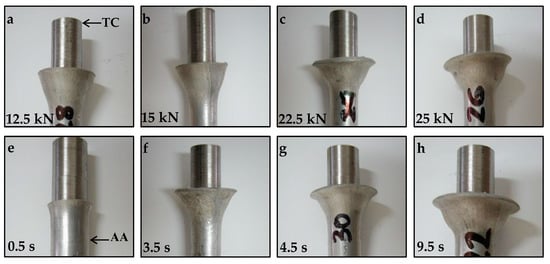 The appearance of the TC/AA joints at various friction forces and at a constant friction time equal to 9.5 s (a–d), and the influence of various friction times at a constant friction force equal to 12 kN (e–h).