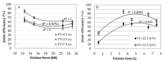 The graphical results of joining efficiency (JE) as a function of friction forces (Figure 6a) and friction time (Figure 6b) are interesting. Figure 6a shows that the best joining efficiency was obtained with lower friction forces and friction times, regardless of friction time. A confirmation of the former conclusion is found in Figure 6b, wherein with a friction force FF = 12.5 kN for friction times between 4 and 5 s, the JE value reached 75% and is 20% higher compared to a FF = 25 kN.