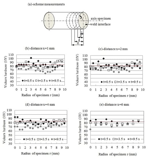 The graphs presented in Figure 7 illustrate the hardness distribution in aluminum as a function of distance: x = 1, 2, 4, and 6 mm from the interface (see scheme on Figure 7a) for three friction times, 0.5, 3.5, and 9.5 s and constant friction force of 12.5 kN. Among the many graphs obtained for different friction forces in the experiment, a friction time of 12.5 kN was chosen because it produced the best joining strength, achieving 234 MPa. As seen in Figure 7, the hardness distribution had a complex character. The hardness of the parent aluminum alloy rod was 83 µHV, but at welding, the interface achieved 95 µHV, depending on friction time. The average joint hardness decreased as the friction time increased. A softened region can be seen at distance of about 4 to 8 mm from the interface. The highest hardness, of 110 µHV, of the sample was recorded in the joint axis near the weld interface. The hardness in the half-radius specimen slightly decreased to 78 µHV and 65 µHV for FT = 0.5 and 9.5 s, respectively (see Figure 7a,b). The hardness of aluminum alloy at the center was higher than in other areas of the specimen with shorter friction times of 0.5 and 3.5 s. The hardness of the specimen subjected to a longer friction time, e.g., 9.5 s, was lower than that of the base alloy. The surface hardness of the specimen increased and reached the value of parent metal. Finally, the average hardness decreased with the distance from the joint interface. The last graph (Figure 7e) shows no significant changes in the hardness distribution in the plane located 6 mm from the interface.