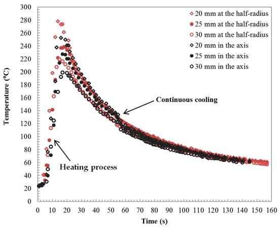 Time-temperature profiles at the half-radius and center line of the specimens are shown in Figure 8.