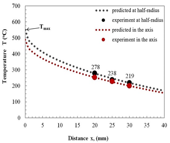 The empirical models’ goodness fit the examined data, with a higher R-squared = 0.99. The predicted maximum temperatures in the axis and half-radius of the specimen amounted to 488 and 550 °C, respectively. The maximum temperature of aluminum alloy (550 °C) was lower by about 100 °C than the melting temperature of the base material (~650 °C).