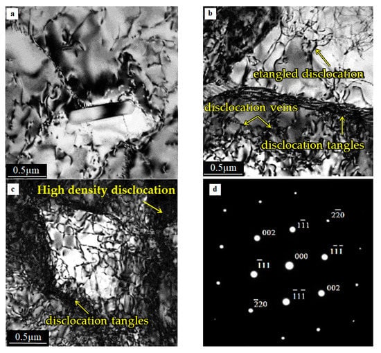 Small precipitates are observable at the central part of the micrograph. Additionally, small-angle dislocation grain sub-boundaries are visible in the micrograph. A similar distribution of dislocation is observed in Figure 12b. However, as follows from the difference in contrast, the up and down grains visible in the micrograph are divided by the high angle boundaries. Figure 12b,c shows that some simple dislocation patterns, such as dislocation veins and tangles, can still be found in the grain and at the grain boundary. Similar observations of the dislocation microstructure were reported by authors [34]. The micrograph depicted in Figure 12c shows a distorted region with a high dislocation density accumulated in the sub-grain boundary. It can be seen that, despite a high dislocation density, there is no sign of distortion in the selected diffraction pattern SAD photo, Figure 12d.