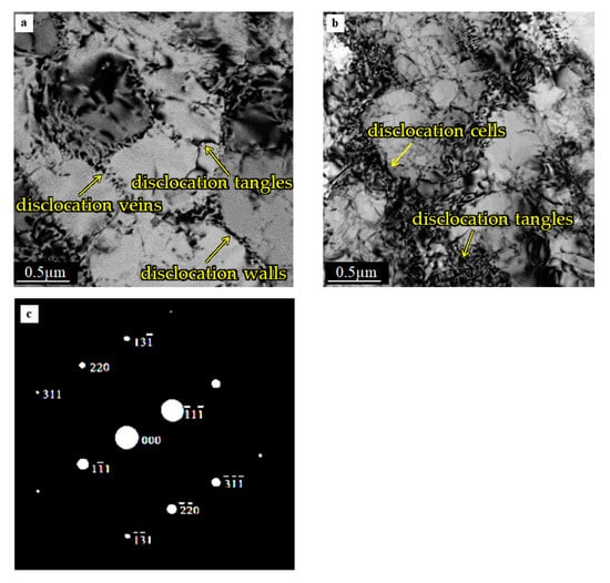 In two-electron micrographs (Figure 13a,b), typical dislocation cell microstructures are visible. The mean diameter of the dislocation cell is approximately 2–3 µm, and often even less. Dislocation walls and incipient cells prevailed, and dislocation veins (see Figure 13a) are observed in the interior regions. The dense dislocation tangles tend to form walls in the grain (Figure 13b). There is no evidence of marks such as diffusivity, stretching, or curvature of the diffraction spots on diffraction pattern (see Figure 13c). It can be seen that the microstructure showed in Figure 13 is very similar to the base material presented in Figure 10.