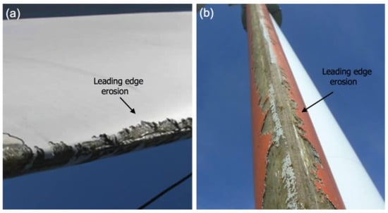 Leading edge erosion damage on two blades (a) and (b) (reprinted from [11], with permission from Elsevier).