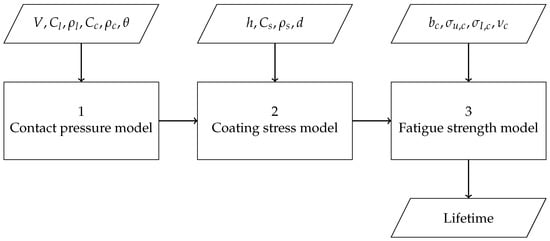 Regarding the modeling framework proposed in Figure 2, Equation (1) can be considered as the contact pressure model, Equations (10) and (11) as the coating stress model and Equations (2), (3) and (12) as the fatigue strength model. The lifetimes are then calculated by Equations (4) and (5).