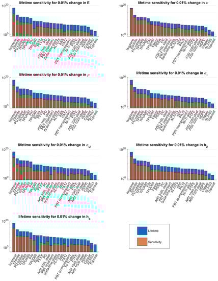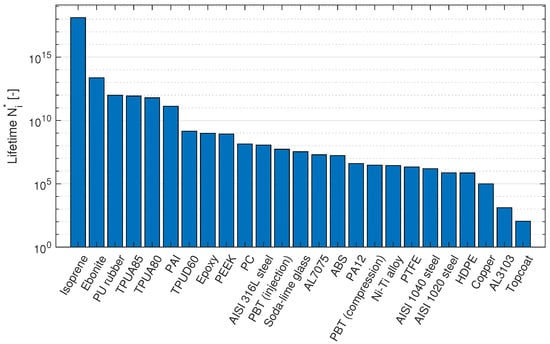 The average sensitivity for the materials defined in Table 2 was determined in order to perform a global sensitivity analysis. The results can be found in Figure 7. This figure shows the predicted lifetime and the sensitivity, i.e., the change in lifetime for a variation of 0.01% in an input parameter. It can be seen that a change in Poisson ratio has a large effect on the predicted lifetimes for elastomeric materials, e.g., isoprene, ebonite and PU rubber. Moreover, it can be seen that for some materials, e.g., AISI 316L steel and soda lime-glass, the strength parameters play an important role in lifetime sensitivity. Looking at the material parameters of these materials, it can be observed that the values of and are close to each other or the Poisson ratio is close to 0.5.