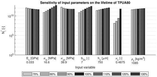 The sensitivity study for the TPUA80 reference material is given in Figure 4. It can be seen that the largest influence on the lifetime is caused by the Poisson ratio: a lower value results in a significantly lower lifetime. The strength parameters have the second largest contribution: higher values for the fatigue endurance limit and lower values for ultimate tensile strength result in a longer lifetime.