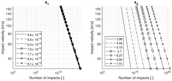 In order to study the effects of the constants and , the VN curve is required. This curve plots the number of impacts against the impact velocity and is generally used to display fatigue life. The VN curves for variations in the constants and are given in Figure 6. It can be seen that the effect of on the coating life is very limited. The influence of is more prominent: the graph shows significant changes in coating lifetime and the slope of the fatigue curve. By changing the ratio of to , the curve can be shifted along the x-axis. This is a common approach for fitting the Springer model to rain erosion test data.