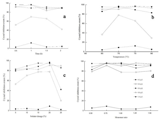 As shown in Figure 2a, the crystal-inhibition extent increased with increasing temperature in a certain monomers ratio, but further increase of the temperature resulted in a reverse trend. The variation trend of crystal-inhibition extent with monomers ratio was similar to that mentioned above. This trend was also found in Figure 2b,c. However, it was obvious that the radian of the surface in Figure 2b,c was significantly smaller than that in Figure 2a. According to the above analysis, combined with Figure 2d–f, it could be determined that the order of the influence of interaction on the crystal-inhibition performance of MBFA was: reaction temperature / monomers ratio (X1X2) > reaction temperature / initiator dosage (X1X3) > monomers ratio / initiator dosage (X2X3).