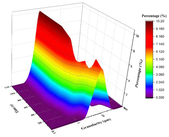 MBFA could disperse phosphate suspension and sediments in solution. So, adding MBFA into calcium phosphate suspension could effectively reduce the size of solid particles. As shown in Figure 3, with the increase of time, the particle size of solid decreased gradually. After about 60 s, the particle size of half the number of particles had been reduced to 1 μm. It indicated that MBFA had a significant and efficient dispersion effect on calcium phosphate crystals.