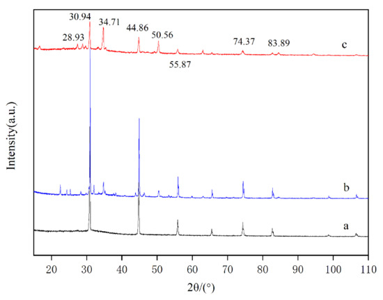 X-ray diffraction analysis contributed to the internal molecular structure information of materials, which was used to determine the crystal structure. Figure 5 shows the X-ray diffraction contrast patterns of calcium phosphate, MBFA and calcium phosphate added with MBFA. In curve (a), there were obvious diffraction peaks at 30.94°, 44.86°, 55.87° and 74.37°, among which the peaks were sharp at the first two. It indicated that calcium phosphate crystals grew well. In curve (c), the diffraction peaks of 30.94°, 44.86°, 55.87° and 74.37° were greatly weakened, and the diffraction peaks of 34.71° and 50.46° were enhanced. The original diffraction peak disappeared at 83.89° and an amorphous peak appeared at 28.93°. It showed that the growth of calcium phosphate crystals was inhibited, and the crystal form of calcium phosphate changed. As a result, other amorphous structures were formed, and the crystallinity became poor.