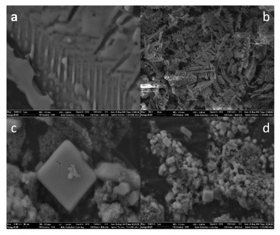 SEM images of calcium phosphate crystals (a,b), crystals with MBFA (c,d).
