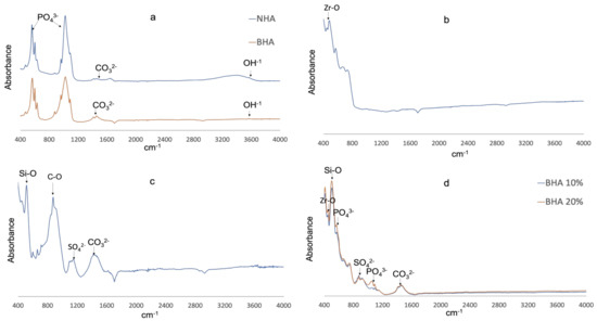 FTIR Spectra. (a) NHA (blue) and BHA (red). (b) Zirconia dioxide. (c) Portland cement. (d) BHA10% (blue) and BHA 20% (red).